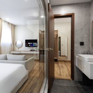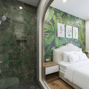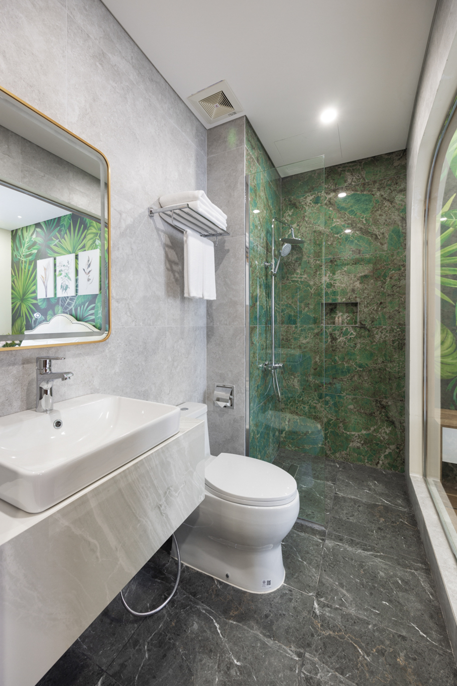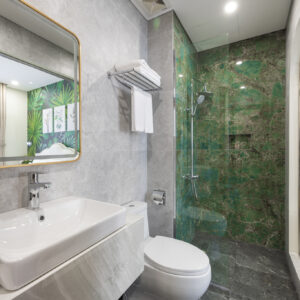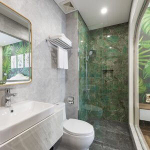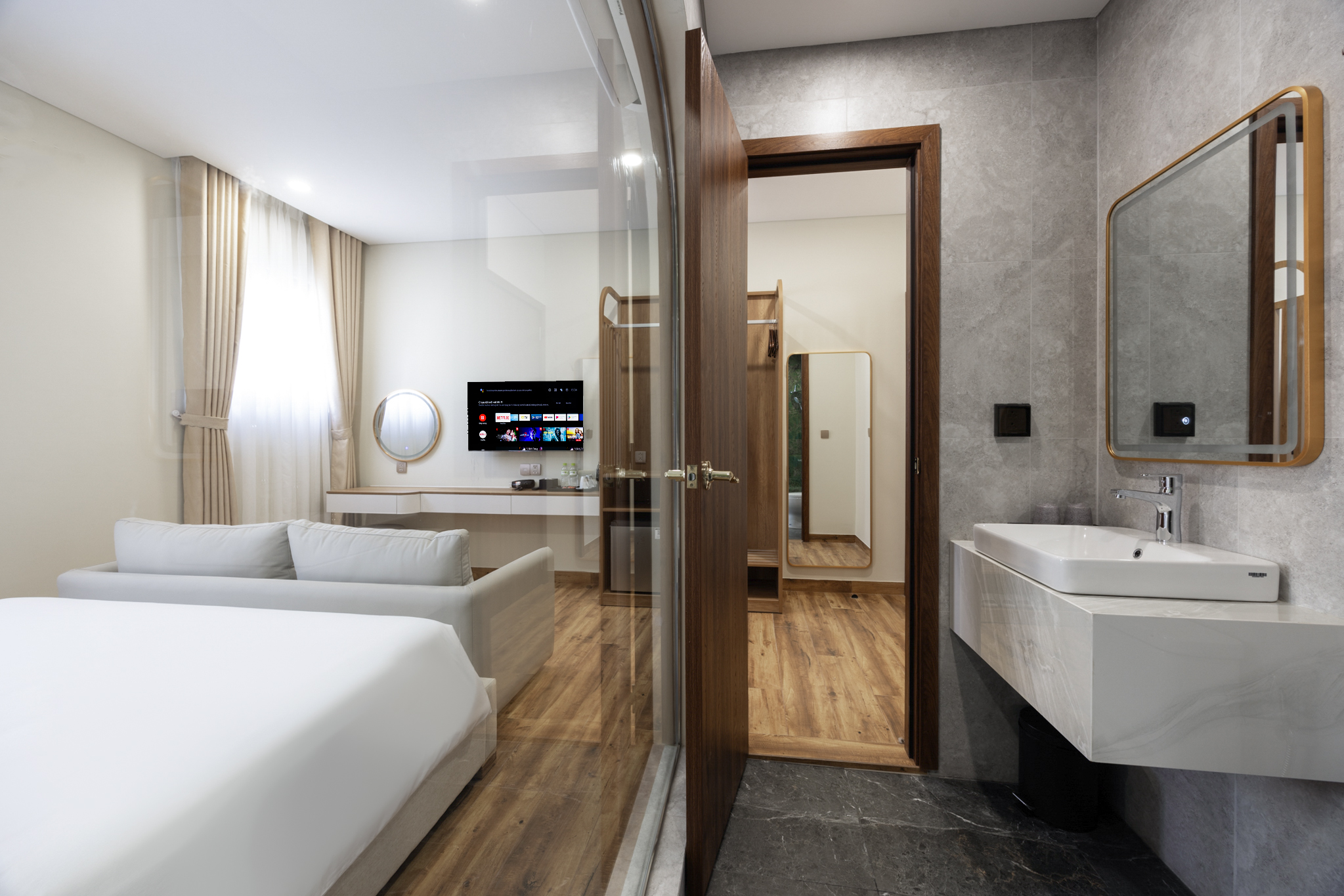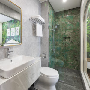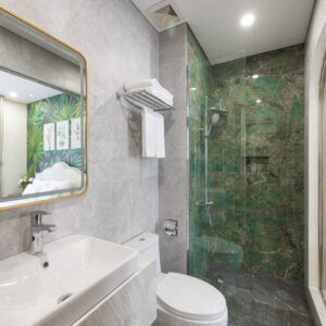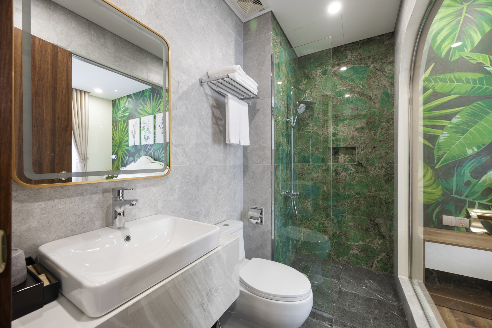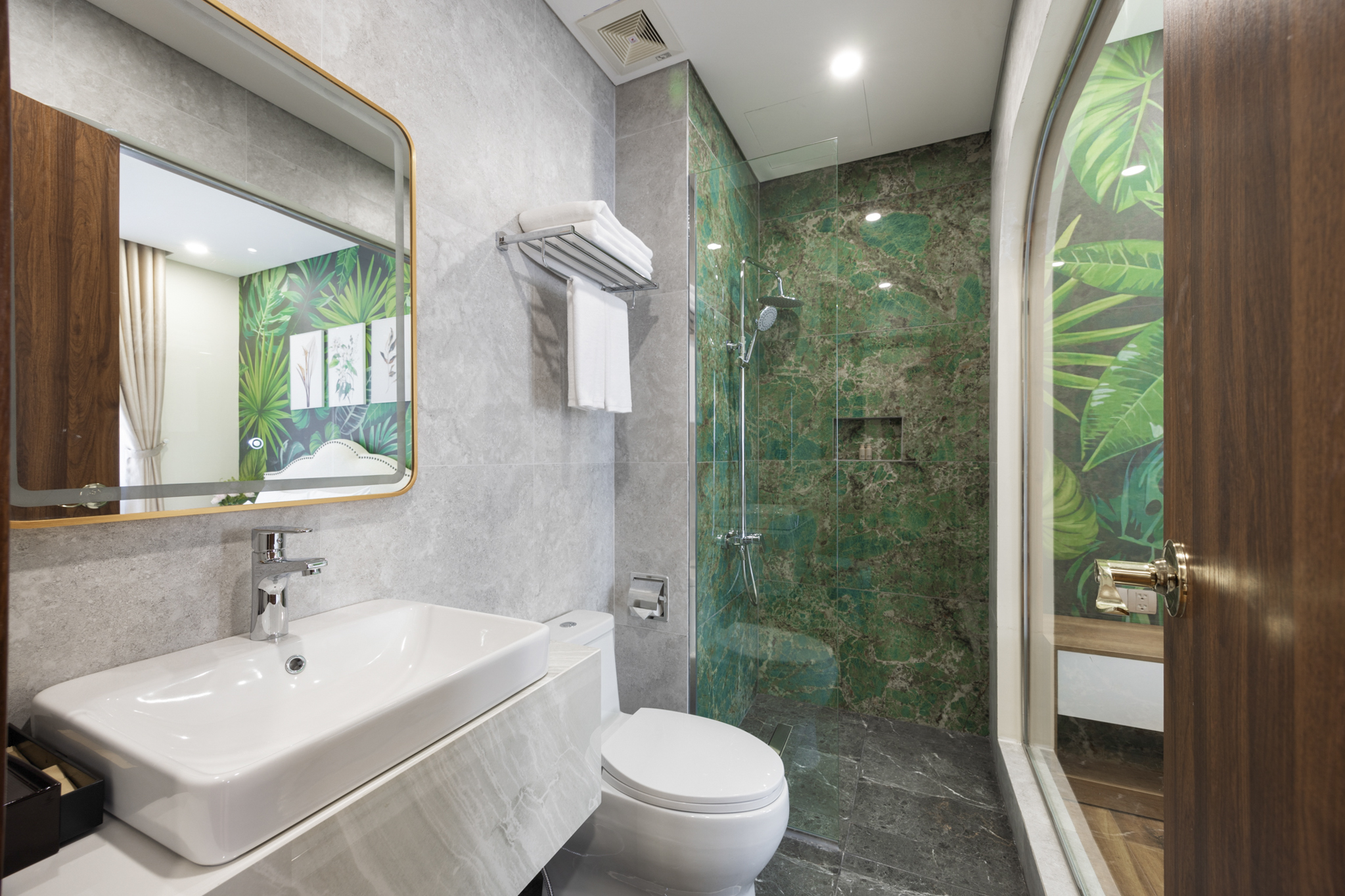 - Phòng tắm riêng biệt, trang bị vòi sen hiện đại, bồn rửa tay đôi và các sản phẩm vệ sinh cá nhân cao cấp.